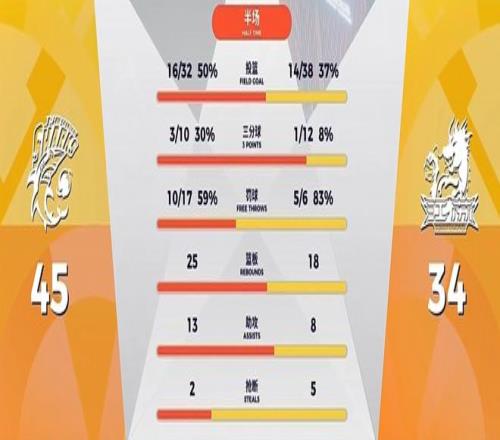 半場戰罷,上海男籃45比34領先,江蘇隊半場投籃命中率不足4成,3分球更是12投1中,整體手感糟糕。