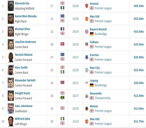 水晶宮隊史賣人榜:埃澤、萬比薩卡、奧利塞前3,格伊第6
