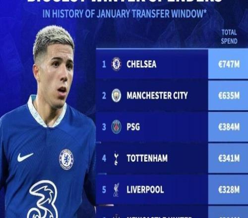 冬窗歷史轉(zhuǎn)會支出榜:切爾西7.47億歐居首,前十英超占8席