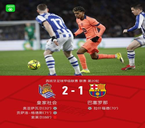 北京時(shí)間1月19日西班牙足球甲級(jí)聯(lián)賽 聯(lián)賽 第20輪,皇家社會(huì)主場(chǎng)對(duì)陣巴塞羅那。上半場(chǎng),奧亞薩瓦爾凌空抽射破門(mén)...