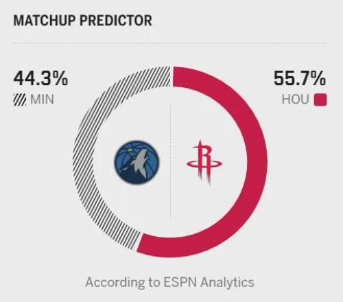 兩隊(duì)都是聯(lián)盟攻防一體的球隊(duì),火箭防守效率第4、進(jìn)攻效率第3,森林狼進(jìn)攻效率第8、防守效率第6。不過,森林狼的整體投籃和三分命中率更占優(yōu)勢,且擅長攻守轉(zhuǎn)換,內(nèi)線得分、二次進(jìn)攻等數(shù)據(jù)表現(xiàn)亮眼,極其考驗(yàn)著火箭的防守整體性;而火箭近期進(jìn)攻低迷,上一場不敵雷霆?jiǎng)?chuàng)賽季得分新低,連續(xù)多場三分命中率低于30%,進(jìn)攻端的復(fù)蘇是取勝關(guān)鍵。此外,兩隊(duì)均缺乏首發(fā)級(jí)控衛(wèi),森林狼的康利年邁、迪林厄姆尚嫩,火箭則依靠申京擔(dān)任組織中鋒,這也為比賽增添了不確定性。ESPN賽前預(yù)測火箭今天取得的概率為55.7%,森林狼取得的概率則是44.3%。