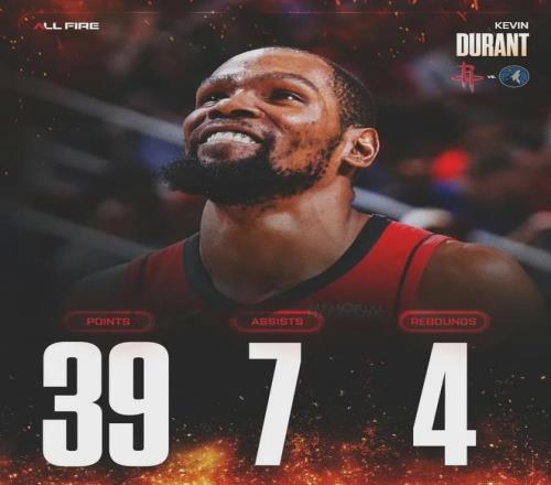 此役背靠背出戰的杜蘭特亮相40分鐘,投籃18中11(三分8中6)高效砍下39分4板7助2斷1帽。