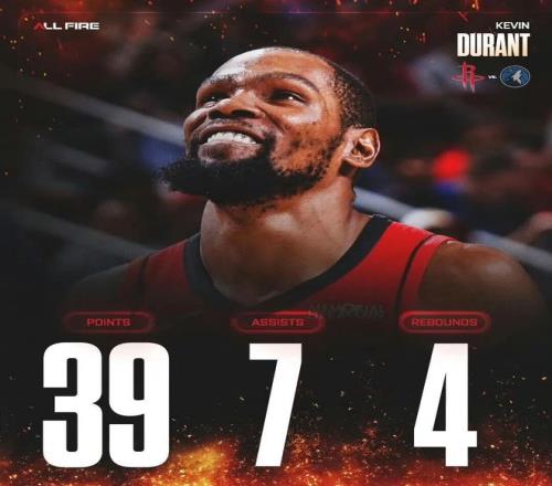 此役背靠背出戰的杜蘭特亮相40分鐘,投籃18中11(三分8中6)高效砍下39分4板7助2斷1帽。