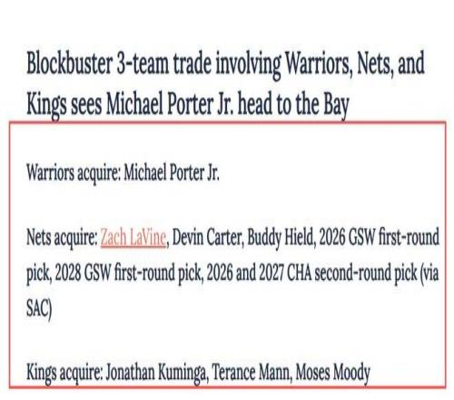 聯盟內部對這筆交易的共識是,多方框架是實現共贏的唯一路徑。由于勇士對小波特的興趣明確,而籃網渴望積累更多重建資產,庫明加成為了關鍵的“橋梁型籌碼”。這位23歲鋒線在1月15日交易限制解除后,其合同價值被重新激活——2026-27賽季2430萬美元的球隊選項,既具備薪資匹配的靈活性,又能為第三方球隊提供后續操作空間,被管理層視為“復雜交易中的優質資產”。最終浮出水面的潛在方案的核心的是:勇士引進小邁克爾·波特;籃網收獲扎克·拉文、德文·卡特、巴迪·希爾德,以及勇士2026年、2028年首輪簽和通過國王獲得的2026、2027年黃蜂次輪簽;國王則得到喬納森·庫明加、特倫斯·曼與摩西·穆迪。