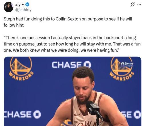 賽后庫里談及這一幕時表示:“那個回合我是故意在后場待了好久,就是想試試他能跟我多久,我倆都心知肚明在干嘛,玩得挺開心。”