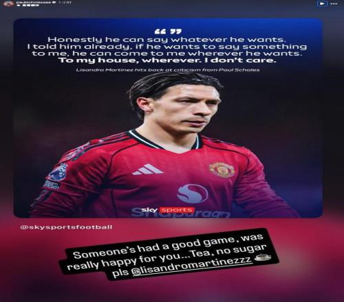 斯科爾斯回應利馬:有人踢了一場好球,真替你感到高興 懂球帝 2026-01-19 01:17:11 曼聯名宿斯科爾斯在曼市德比前質疑利桑德羅-馬丁內斯防不住哈蘭德,這位曼聯后衛在賽后接受采訪時表示斯科爾斯如果想說什么可以去他家,對此,斯科爾斯在社交媒體回應了利桑德羅-馬丁內斯的采訪。斯科爾斯在社交媒體轉載了利桑德羅-馬丁內斯在曼市德比后的采訪,并寫道:“有人踢了一場好球,真的為你感到高興……來杯茶,不加糖,謝謝??”【上咪咕獨家看英超】英超免費觀看_曼聯免費觀看_斯科爾斯免費觀看_英超高清在線_曼聯高清在線_斯科爾斯高清在線 英超 曼聯 斯科爾斯 馬丁內斯 利桑德羅 上一篇: 卡塞米羅:曼聯總是要爭取在頂端,我們要和教練互相支持 下一篇: 范博梅爾稱贊卡里克帶來了精神力量,哈蘭德還有一些技術漏洞