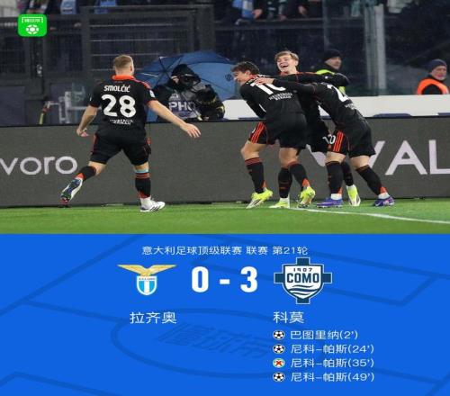 北京時間1月20日,意大利足球頂級聯賽第21輪,拉齊奧主場迎戰科莫。比賽開局階段,科莫球員阿萊士-巴列送出助攻,巴圖里納破門得分,為球隊取得領先。隨后,卡克雷成功策動進攻,幫助尼科-帕斯再下一城。上半場臨近結束前,尼科-帕斯主罰點球未能命中,錯失擴大比分的機會。易邊再戰后,巴圖里納完成助攻,尼科-帕斯接應破門,完成個人本場比賽第二次進球。最終全場比分定格在拉齊奧 0-3 科莫。